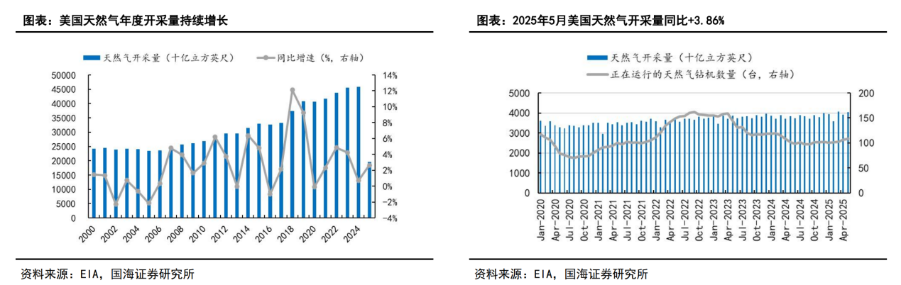 据EIA数据,截至2025年5月,美国正在运行的天然气钻机数量达108台,较去年同期下降6.09%。但天然气开采量仍在继续提升,据EIA数据,2025年5月,美国天然气累计开采量约19.53万亿立方英尺,同比+2.64%。