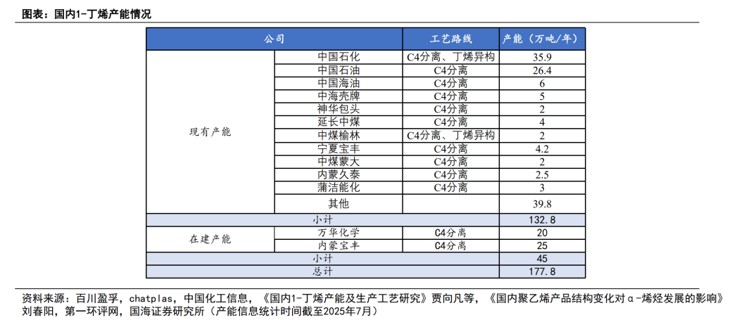 近年来,随着中国一批新建炼化项目的投产,1-丁烯产能持续增加,截至2025年7月,1-丁烯产能为132.8万吨;其他α-烯烃产品正在逐步突破。