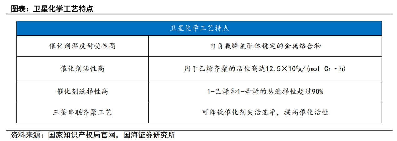 卫星化学于2021年12月28日申请发明专利《一种用于乙烯齐聚的催化剂组合物及其制备方法和应用》,其自主研发的催化剂活性高、选择性好,适用于乙烯齐聚制备α-烯烃,尤其是1-己烯、1-辛烯。