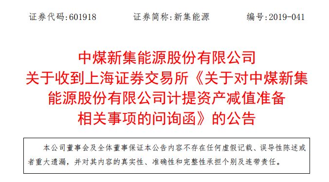 新集能源巨额资产计提公告引起了交易所的关注。12月29日晚,新集能源公告,公司于2019年12月27日收到上交所关于对中煤新集能源股份有限公司计提资产减值准备相关事项的问询函,直指两大核心问题。
