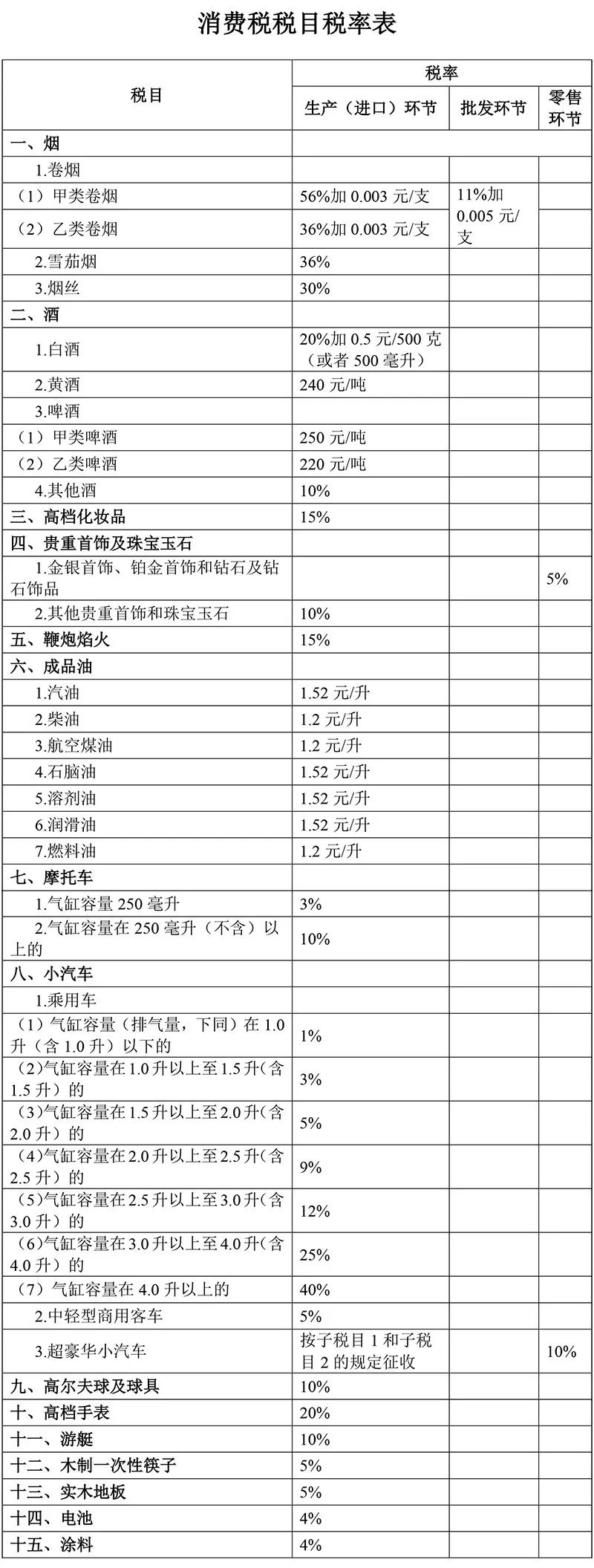 第二条 消费税的税目、税率和征收环节,依照本法所附《消费税税目税率表》执行。