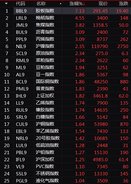 从期货市场的情况来看,更能看出价格变动对于股票市场的驱动。基本金属方面,沪铅涨逾1%,铅锭供应担忧上升;农产品方面,豆粕涨逾2%,库存偏低;能化品方面,聚丙烯涨逾3%,价格上涨;黑色系方面,焦煤涨逾4%,供需格局收紧;能源全线反弹,原油涨逾2%,液化石油气、低硫燃料油涨逾1%;贵金属方面,沪金、沪银均上涨。
