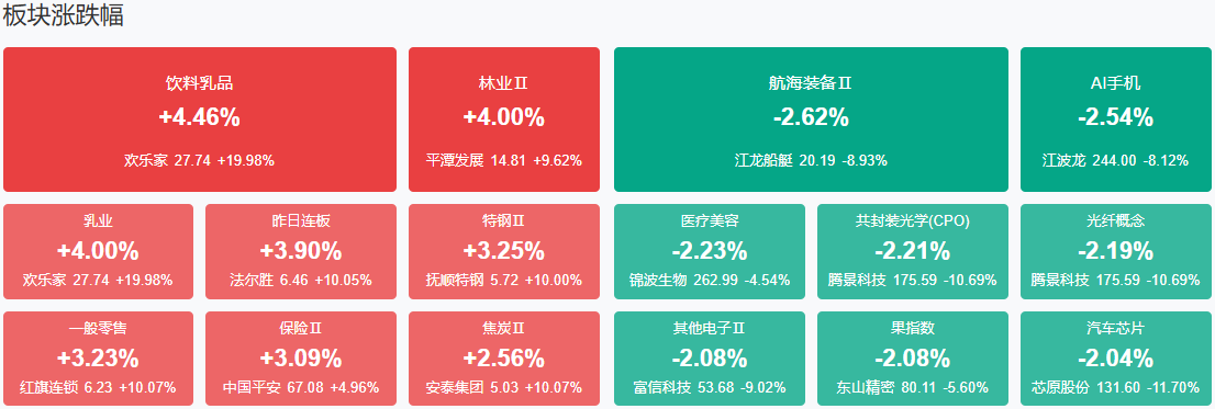板块方面,乳业、保险、零售、贵金属等板块涨幅居前,CPO、影视院线、半导体等板块跌幅居前。截至收盘,沪指跌0.55%,深成指跌1.1%,创业板指跌1.77%。