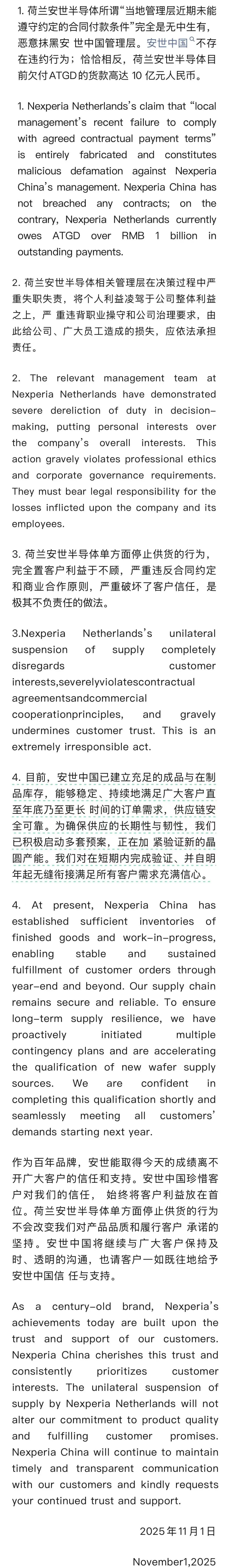 安世中国表示,荷兰安世半导体单方面决定自2025年10月26日起停止向位于东莞的封装测试工厂(ATGD)供应晶圆。在致客户的函件中,荷兰安世半导体声称此举系所谓的“当地管理层近期未能遵守约定的合同付款条件的直接后果”。安世中国称:“上述言论混淆视听,极具误导性,我们对此极为震惊并强烈反对。”