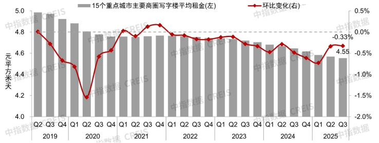 三季度全国重点城市主要商圈写字楼平均租金为4.55元/平方米/天 环比下跌0.33%