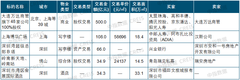 2025年前三季度,以披露交易金额的交易计算,中指数据共监测到大宗交易1336亿元。受太盟投资联合体500亿元收购48家万达广场、中邮保险108亿元收购上海博华广场等大金额交易影响,交易金额同比增长37.4%。其中一线城市交易金额为649亿元,上海、北京交易金额均超200亿元,深圳、广州交易金额合计约140亿元。二线城市交易金额为362亿元,其中成都、厦门、杭州、南宁交易金额相对较大,在30亿元以上,苏州、长沙、武汉在20-30亿元之间。三四线城市交易金额为325亿元,其中佛山交易金额超50亿元,东莞、金华在20-30亿元之间。