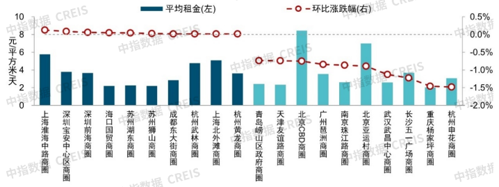 2.商圈表现:八成监测商圈租金环比下跌,杭州申花、重庆杨家坪等商圈跌幅相对较大