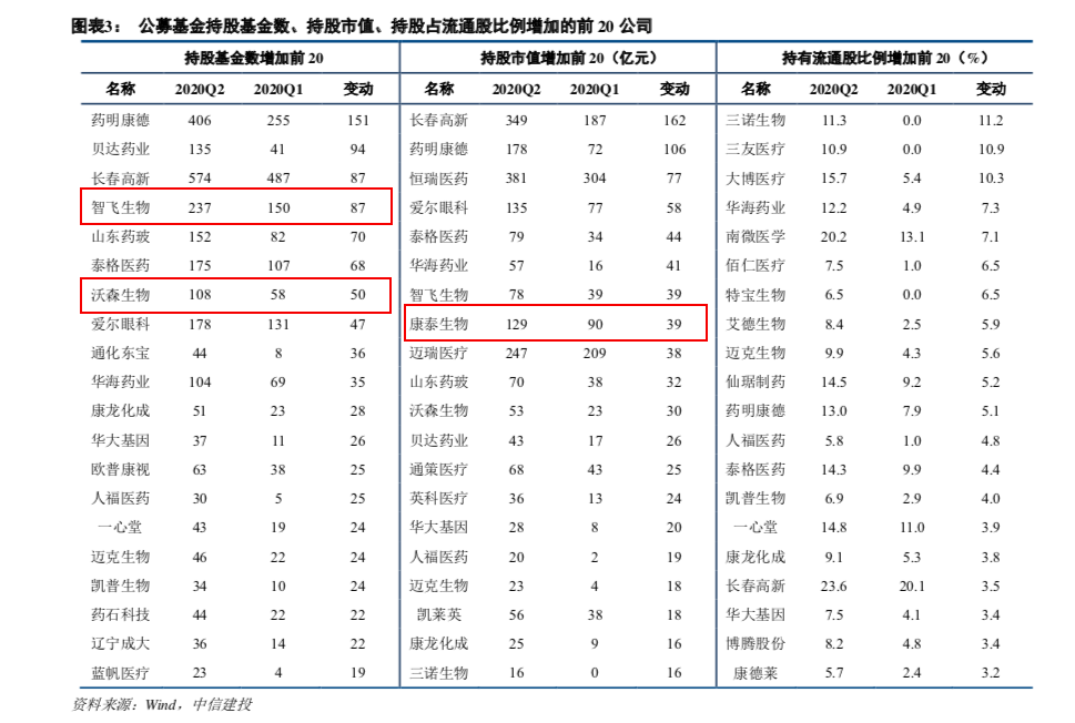 从公募基金二季度持仓来看,情况的确也是如此。统计显示,二季度,公募基金持续加配医药,从持股变化来看,在创新药产业链、疫苗、器械、原料药以及抗疫获益公司上加仓较多。其中,智飞生物、沃森生物Q2基金持仓数较之Q1均有明显增加,另外,康泰生物的持股市值也有较大增加。