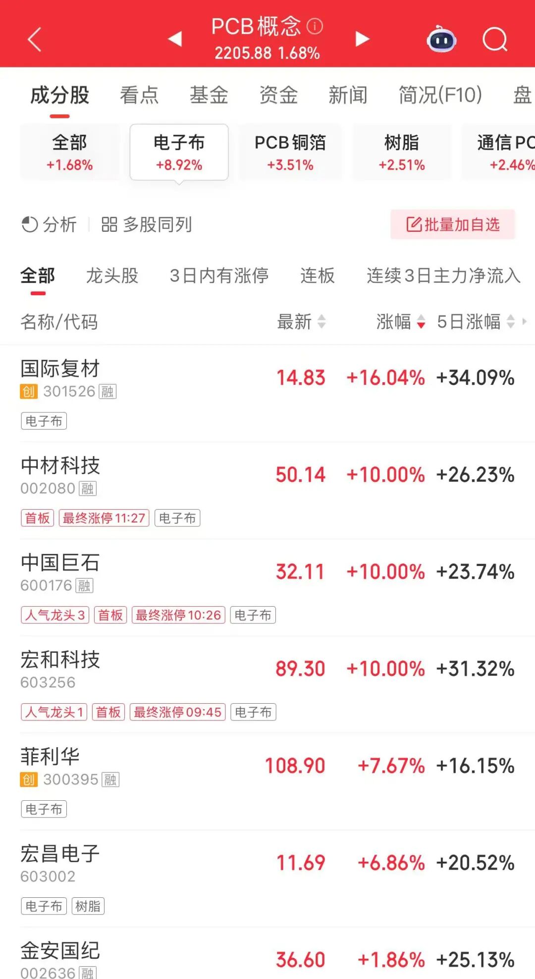 AI硬件端活跃,共封装光学(CPO)、PCB概念涨幅居前。其中,电子布概念股表现亮眼,龙头股中国巨石、中材科技、宏和科技涨停。