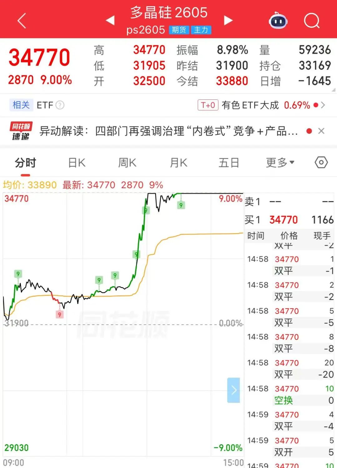 消息面上,截至国内商品期货收盘,多晶硅主力合约涨停,碳酸锂涨超5%,原油、LU燃油等涨逾3%,沪镍、工业硅等涨超2%,沪铜、铁矿石等涨超1%,纯碱、热卷等小幅上涨。