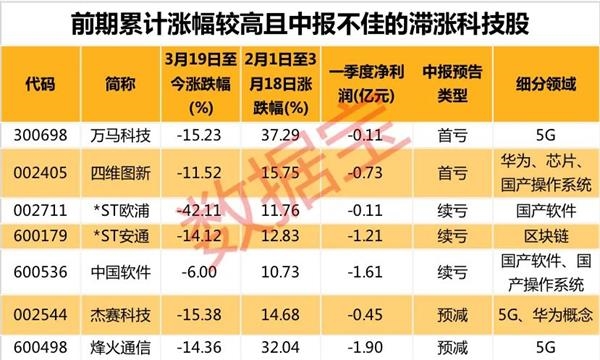比如跌幅居首的*ST欧浦2月1日至3月18日累计上涨11.76%,中报预告类型为续亏;福日电子2月1日至3月18日累计上涨74.33%,但一季度净利润亏损0.56亿,中报业绩类型为不确定;四维图新中报业绩类型为首亏,一季度亏损0.73亿元,3月19日以来累计下跌11.52%,而2月1日至3月18日累计上涨接近16%。