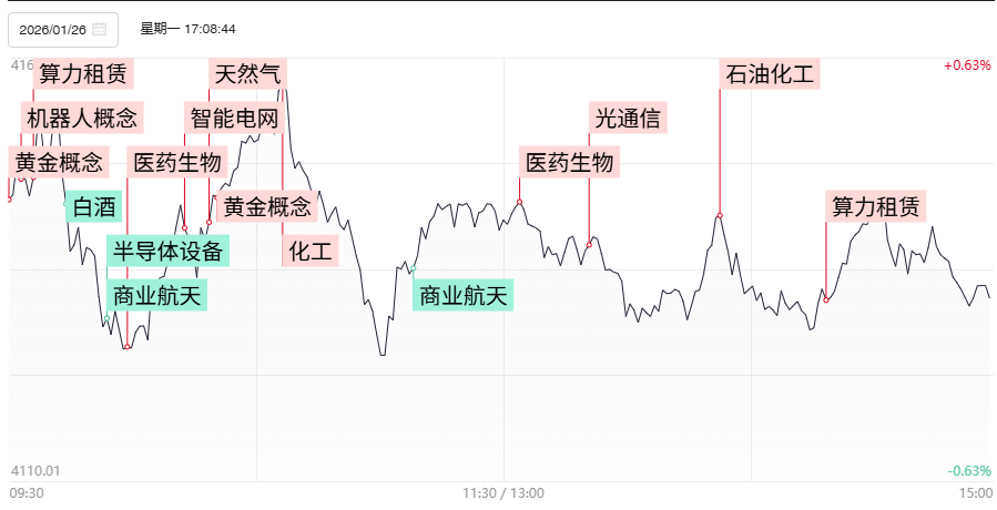 今日70股涨停,40股炸板,封板率为64%,白银有色5连板,明阳智能3连板,瑞华泰20cm 2连板,九鼎新材9天5板,四川黄金8天4板,洲际油气4天3板。市场全天震荡调整,大小指数分化明显,深成指、创业板指高开低走,盘中均一度跌超1%。沪深两市成交额3.25万亿,较上一个交易日放量1630亿。盘面上,市场热点较为杂乱,全市场超3700只个股下跌。板块方面,有色、油气、光伏、化工板块领涨;商业航天、体育、半导体、军工板块领跌。截至收盘,沪指跌0.09%,深成指跌0.85%,创业板指跌0.91%。