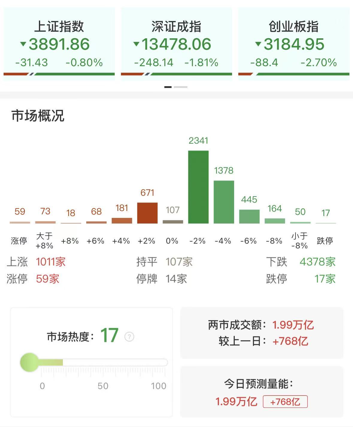 市场震荡走低,三大指数集体收跌,创业板指与科创50双双跌超2%。沪深两市全天成交额1.99万亿,较上个交易日放量768亿。盘面上热点较为杂乱,全市场近4400只个股下跌。从板块来看,高铁概念延续强势,神州高铁2连板,金鹰重工20CM涨停。商业航天概念逆势走强,神剑股份走出4连板。创新药方向反复活跃,津药药业、凯莱英等涨停。下跌方面,存储芯片概念集体下挫,佰维存储、德明利、香农芯创大跌。截至收盘,沪指跌0.8%,深成指跌1.81%,创业板指跌2.7%。