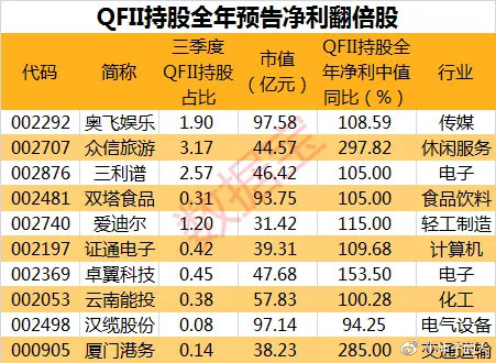 数据宝统计显示,已公布的全年业绩预告中,QFII持股公司净利润增幅中值超100%的有10家公司,如奥飞娱乐、众信旅游、三利谱等,其中众信旅游、证通电子、卓翼科技等今年涨幅较小。