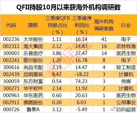 10月以来,共有11家QFII持股公司获海外机构调研,其中大华股份获海外机构调研次数最多,达41次,海大集团、乐普医疗、歌尔股份获调研次数分别有16次、14次、8次。