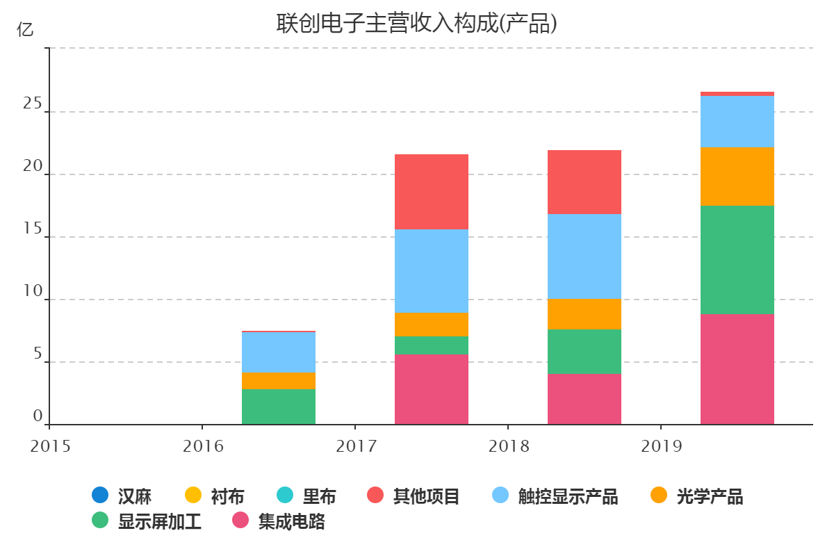 联创电子是一家专业从事研发、生产及销售为智能手机、平板电脑、运动相机、智能驾驶、智能家居、VR/AR等配套的光学镜头、摄像模组及触控显示一体化等关键光学、光电子产品的高新技术企业,并发起设立集成电路产业基金,投资集成电路产业。2019年上半年,公司光学产品收入占17.45%,显示屏加工占32.4%,触控显示占15.78%,集成电路占33.2%;集成电路暂未贡献太多毛利,光学产品、显示屏加工和触控显示毛利占比分别为35.84%、47.75%和16.04%。