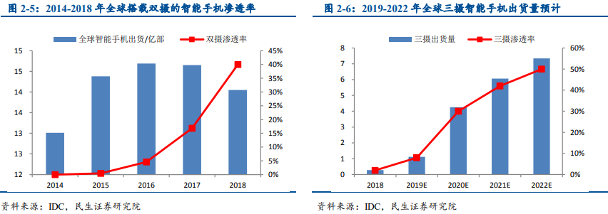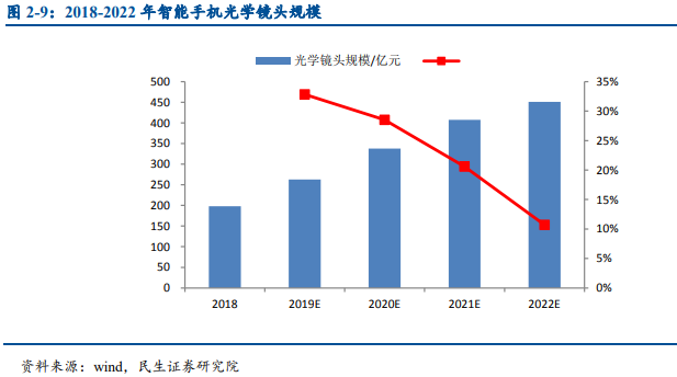 三摄成为智能手机趋势。据群智咨询,华为智能手机三摄渗透率将从 2018 年的 7%提升到 2019 年的 31%。2019 年 9 月,苹果发布 iPhone 11 pro、iPhone 11pro Max、iPhone 11 三款新 iPhone。本次 iPhone 重点升级在后置摄像头,iPhone 11 pro 升级到三摄,从原来的「广角+长焦」升级到「广角+长焦+超广角」的配置;iPhone 11 升级到双摄(1200 像素主摄+1200万像素超广角)。整体来说,三摄是未来的技术趋势,单个手机摄像头增加意味着未来行业将迎来持续增长。据预测,未来两年,智能手机光学镜头的市场规模将保持20%以上的增速。
