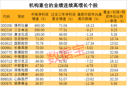 证券时报·数据宝统计,2017~2019年净利润增速连续三年保持在30%以上且2020年中报业绩增速仍超过30%(中报、快报、业绩预告)的个股有19只,包括千亿市值龙头立讯精密和长春高新。其中,14股今年一季报前十大股东中出现了公募基金、社保基金或险资的身影。理邦仪器、三全食品和康龙化成中报预告净利润翻番,中南建设和中联重科过去三年净利润复合增速超过100%。