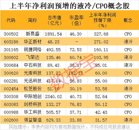 液冷或CPO概念股中,有18只概念股已发布2025年半年报,其中12家业绩预增,CPO板块表现较好,中际旭创、新易盛等行业龙头业绩均为预增。