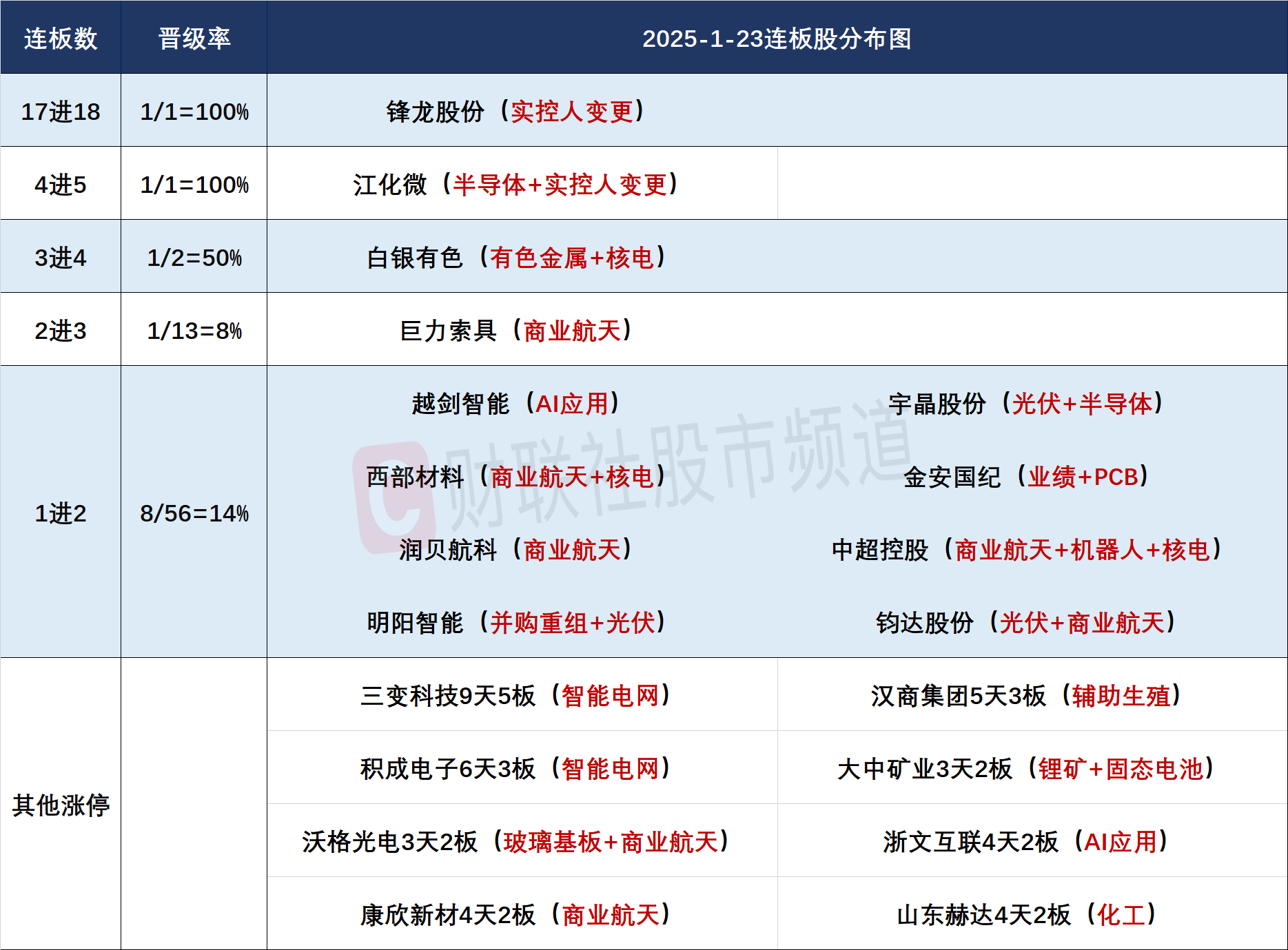 板块方面,商业航天概念在密集利好催化下继续强劲反弹,超三十股涨停或涨逾10%,巨力索具12天7板,西部材料、润贝航科、中超控股均2连板;马斯克在达沃斯表示,在太空设立太阳能AI数据中心是理所当然的事,“太空光伏”引爆市场,光伏板块全线走强,近50股涨停或涨逾10%,其中宇晶股份6天3板,钧达股份、明阳智能2连板,千亿权重隆基绿能涨停,晶科能源、迈为股份、捷佳伟创等20CM涨停。