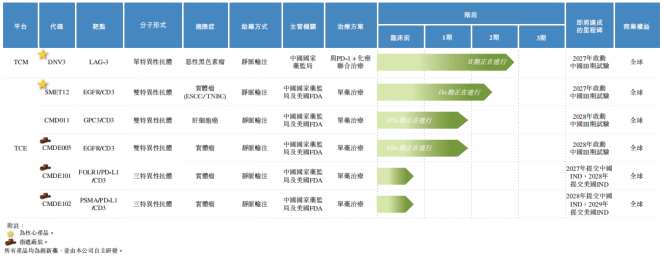 此外,CMD011是一款潜在同类最佳的GPC3×CD3 TCE,CMDE005是一款潜在同类首创EGFR×CD3下一代遮蔽型TCE,二者均已获得FDA 的IND批准,并进入I期临床。CMD011在同类药物中排名全球前二,CMDE005则是中国首个且全球前二进入临床的采用遮蔽肽技术的TCE药物。