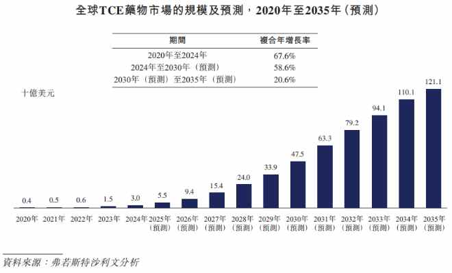 市场规模方面,全球TCE药物市场已从2020年的4亿美元快速增长至2024年的30亿美元,年复合增长率达67.6%。据预测,到2030年市场规模有望升至475亿美元,2035年进一步突破1,200亿美元,市场增长动力强劲。