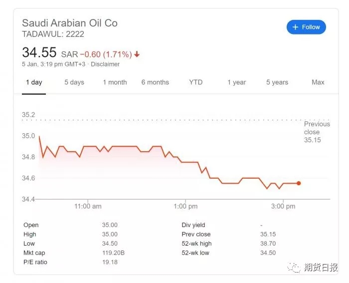 上个月创下全球IPO最高纪录的石油巨头沙特阿美的股价下跌1.7%,至每股34.55里亚尔,创下自12月11日开始交易以来的最低水平。