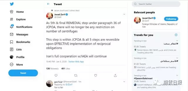 就在刚刚,据中央广播电台总台国际在线消息,当地时间1月6日晚,伊朗外交部长扎里夫在社交媒体上发文称,作为第五阶段也是最后一个“补救”步骤,将针对伊核协议第36条,对离心机的数量将不再有任何限制。此步骤在伊核协议范围内,而所有五个步骤在有效执行对等义务后均可逆。伊朗与国际原子能机构的全面合作将继续。