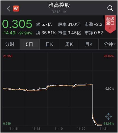 11月21日开盘,雅高控股盘中一度暴跌98.34%至历史新低价0.246港元,随后公司申请停牌,停牌时报价0.305港元,较前一交易日相比2小时蒸发了近450亿。