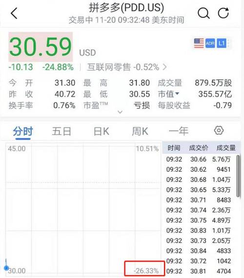 营收不及预期、亏损同比翻倍,受此消息影响,拼多多开盘一度下跌超25%,总市值较前一个交易日瞬间蒸发近120亿美元,约840亿人民币。截至目前,拼多多股价为38.57美元,市值为448亿美元。
