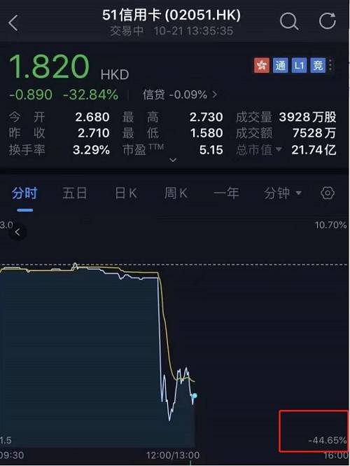 10月21日,有媒体消息称,51信用卡遭遇浙江警方调查,当天下午开盘后,51信用卡在港股市场上就出现了闪崩走势,股价一度暴跌超40%,股价最低触及1.58港元。