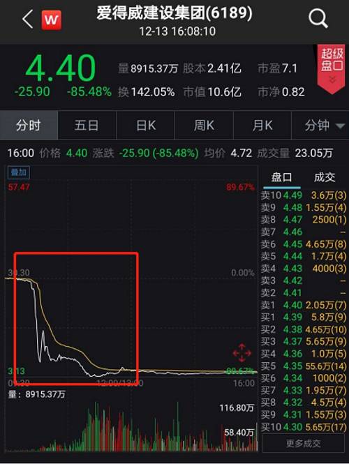 12月13日早盘,港股上市公司爱得威建设集团突然遭遇资金洗盘。从上午十点开始,短短十五分钟时间,股价暴跌超70%以上。截至当日收盘,爱得威建设集团报收4.40元,跌幅超85%,市值仅为10.6亿港元。