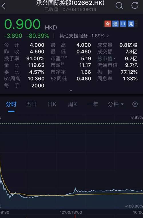 7月8日,承兴国际控股低开近12.9%报4港元,早盘遭“洗仓式”抛盘,一度暴跌约90%,创下0.46港元的逾四年低位,收盘报0.9港元,下跌80.39%,沦为“仙股”。