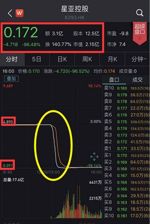 6月25日,港股公司星亚控股向投资者展示了“蹦极式闪崩”技能。当天午后开盘股价迅速下挫,股价从4.89港元“蹦极”跌至0.1港元。截至收盘,跌幅达96.48%,股价为0.172港元,市值蒸发近60亿港元,仅剩2.15亿港元。