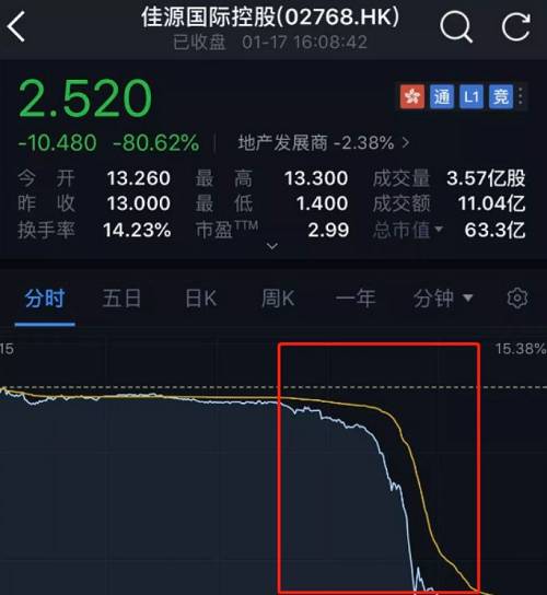 1月17日午后,内地房企上市公司佳源国际控股突然遭遇洗仓式暴跌。当日,股价最低跌至1.4港元/股,跌幅达到89.23%,较前日收盘市值蒸发291.28亿港元。截至当日收盘,佳源国际控股收盘报收2.52港元/股,换手率14.23%,市值63.28亿港元,单日市值蒸发263.16亿港元。