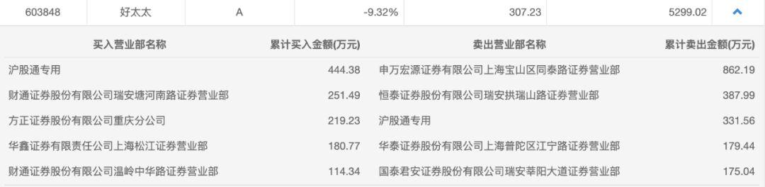 龙虎榜显示,卖方席位前五的多是游资席位,其中申万宏源同泰路营业部净卖出862.19万元居首。分析人士指出,好太太股价已经跌破60日均线,遭到恐慌抛售。