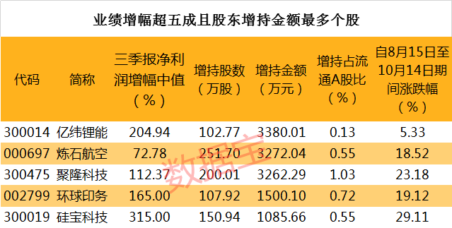 业绩大增个股不但受到机构席位的青睐,上市公司股东也争相增持,248只前三季度业绩增长超过50%的个股中,自8月15日至10月14日期间股东增持的共有5只,增持股数达0.08亿股,增持金额达1.25亿元。