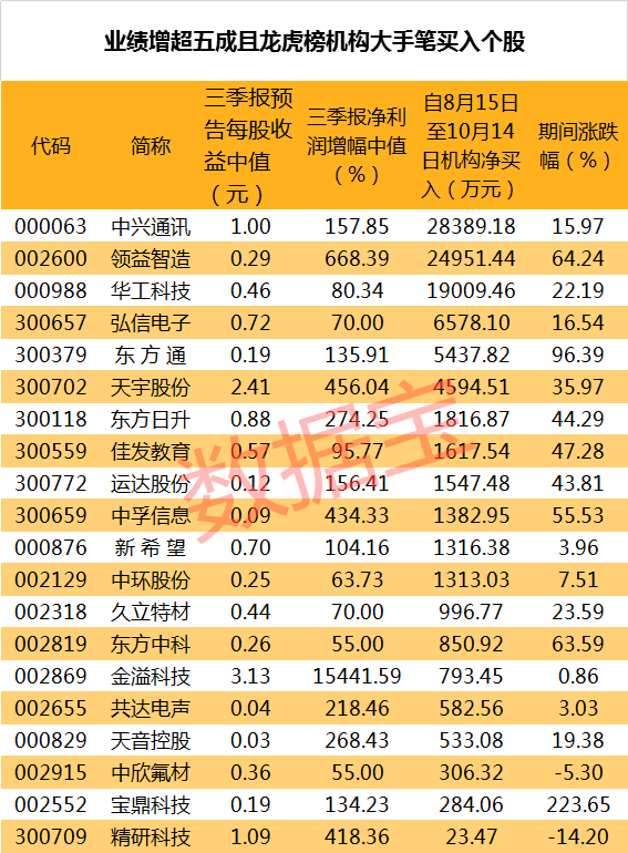 在248只2019年前三季度大幅增长(增幅在五成及以上)的个股中,自8月15日至10月14日期间机构净买入的共有20只,机构净买入买入金额超亿元的有3只,包括中兴通讯前三季度净利润增长157.85%,机构净买入2.84亿元;领益智造净利润增长668.4%,龙虎榜机构资金净流入2.5亿元;华工科技业绩同比增长80.35%,机构净买入1.9亿元。