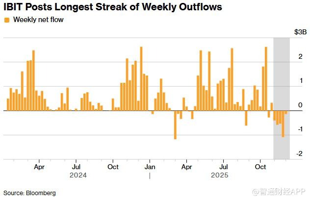 今年早些时候,比特币曾创下12.6万美元的纪录高位,但随后两个月的暴跌(受强制平仓潮、散户热度衰退等因素)驱动令整个加密市场进入全面回调。与此同时,机构资金并未在横盘期间回流。贝莱德旗下的iShares Bitcoin Trust正经历上市以来最长的资金外流期,过去五周累计流出超过27亿美元。以周四额外的1.13亿美元赎回计算,该ETF正迈向连续第六周净流出,显示机构需求仍然疲弱。