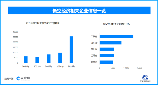 天眼查专业版工商信息数据显示,截至目前我国现存在业、存续状态的低空经济相关企业超10万家。其中,2025年新增注册相关企业超2.5万余家,从企业注册数量趋势来看,近五年间,低空经济相关企业的注册数量呈现稳步增长态势,但在2025年呈现出显著增长,同比增长达162.36%,并达到峰值。