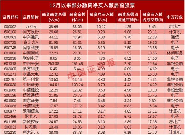 具体到个股,12月以来,共111只个股获融资客加仓逾亿元。其中,万科A融资净买入额居首,达10.12亿元;同方股份居次,为9.20亿元;中兴通讯、京东方A、闻泰科技分获融资净买入6.03、5.85、5.19亿元;中国国旅、 联创电子、中国平安、晶方科技、水晶光电融资净买入额均超过4亿元,第一创业、中信证券、中信建投等11只股票融资净买入额也均在3亿元以上。