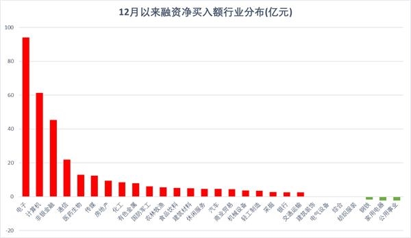 从行业角度观察,12月以来28个申万一级行业中,23个行业呈现融资净买入,6行业融资净买入超10亿元。其中,电子行业融资净买入额居首,达94.17亿元;计算机行业居次,为61.28亿元;非银金融、通信行业分列三、四位,融资净买入额分别为45.39、21.93亿元;医药生物、传媒行业也均有超过10亿元的融资净买入。值得注意的是,融资净买入额超10亿元的6个行业中,电子、计算机、通信、传媒均属TMT板块,4行业合计净买入189.76亿元,占全部28个行业总净买入额比例接近六成。