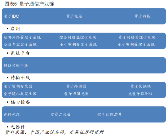 东吴证券此前发布的研报指出,量子通信产业链上游主要是信号处理芯片、雪崩光电二极管(APD)等元器件及各类核心设备。国内能够提供核心设备的公司并不多,主要包括国盾量子(浙江东方参与出资成立)、问天量子和神州量通(都飞通信控股51%)。量子通信产业链中游主要包括网络传输干线提供商和系统集成商。以量子保密通信“京沪干线” 技术验证及应用示范项目为例,提供传输干线服务的公司是中国有线电视网络有线公司,提供系统集成服务的公司包括神州数码(18.270, 1.66,9.99%)系统集成服务有线公司(神州信息子公司)、中国通信建设集团有线公司 (中国通服子公司)等。量子通信产业链下游主要是各种行业应用,如金融、军事、政务、商务等领域。提供的产品包括 量子电话、基于量子保密技术的IDC、量子白板等。该机构认为,量子通信作为高科技新兴产业,未来的应用前景十分广阔。