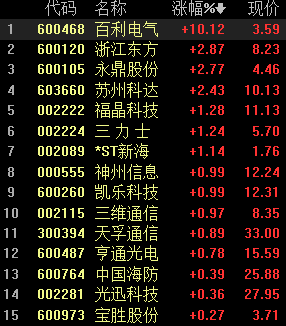 12月2日,量子通信板块开盘走强,盘中涨幅居前,截至发稿,百利电气(3.590, 0.33, 10.12%)涨停,浙江东方(8.110, 0.09, 1.12%)、永鼎股份(4.460, 0.13, 3.00%)、苏州科达(10.080, 0.19, 1.92%)涨逾2%,福晶科技(11.230, 0.25, 2.28%)、三力士(5.660, 0.03, 0.53%)、神州信息(12.430, 0.31, 2.56%)等个股纷纷拉升。