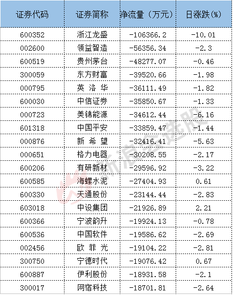 主力资金净流出个股中,浙江龙盛主力资金净流出10.64亿元,净流出资金最多;其次是领益智造、贵州茅台,净流出资金分别为5.64亿元、4.83亿元。