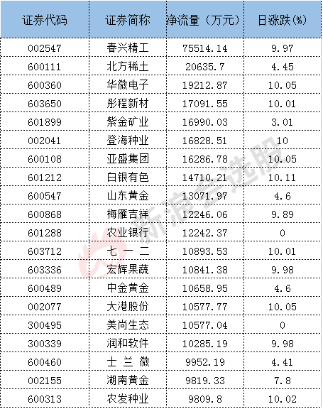主力净流入个股前十:春兴精工、华微电子、彤程新材、白银有色、登海种业、亚盛集团、五矿稀土、梅雁吉祥、七一二、三角防务