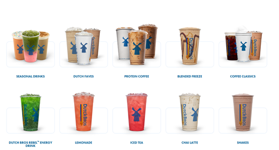 Dutch Bros的核心产品体系围绕“情绪价值+高频复购+参与感”打造,区别于星巴克的精品咖啡逻辑,它更像是饮品界的快乐制造机: