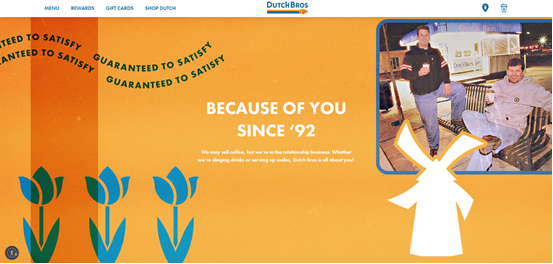 Dutch Bros成立于1992年,诞生在美国俄勒冈州Grants Pass,由两兄弟Dane Boersma与Travis Boersma共同创立。最初,两人用一辆手推车售卖手工咖啡豆,凭借热情的服务和轻松愉快的氛围积累了最早一批忠实顾客。可以说,“人与人之间的连接”从品牌诞生之初就是Dutch Bros最核心的DNA。