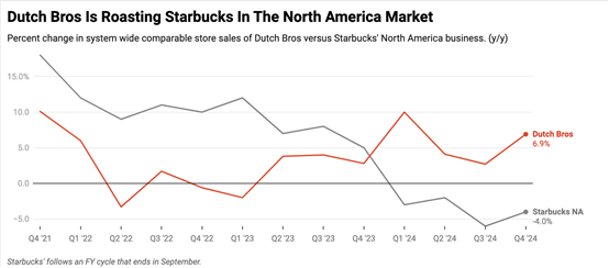 星巴克面临的主要痛点正来自美国本土门店运营失误+人力成本高企+消费信心疲弱,而Dutch Bros通过更轻盈的Drive-Thru模式、直营管理与会员复购护城河,暂时展现出更强的成本消化能力与收入韧性。