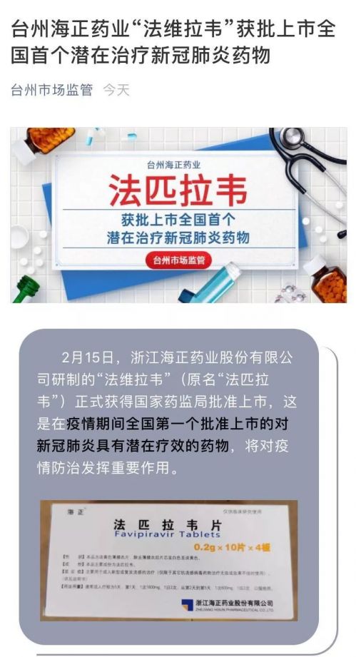 据浙江台州市场监管微信公众号:15日,浙江海正药业股份有限公司研制的“法维拉韦”(原名“法匹拉韦”)正式获得国家药监局批准上市,这是在疫情期间全国第一个批准上市的对新冠肺炎具有潜在疗效的药物,将对疫情防治发挥重要作用。据科技部15日消息,法匹拉韦是目前治疗新冠肺炎三个临床试验西药之一,对治疗新冠肺炎初步显示了较明显的疗效和较低的不良反应。